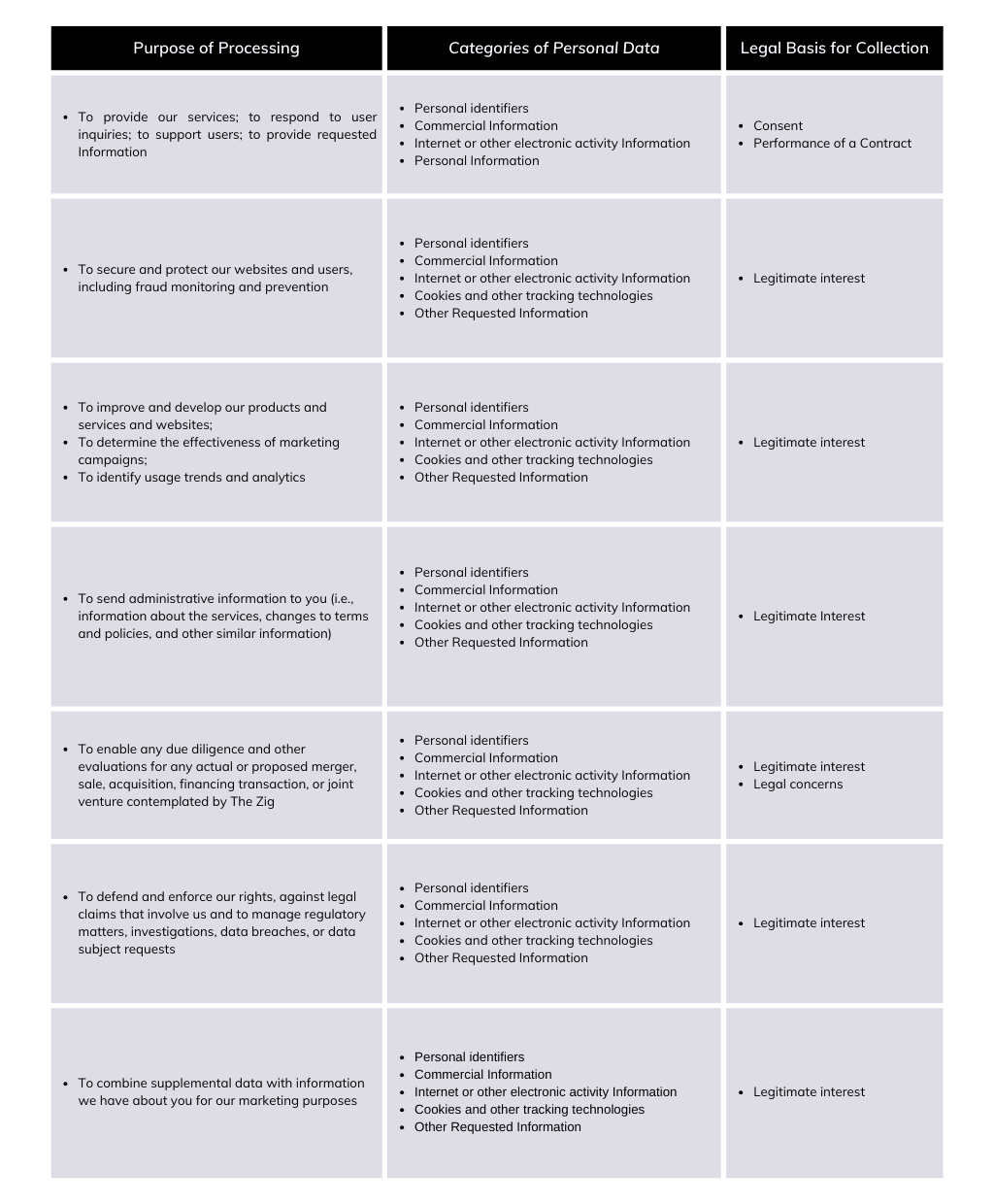 The Zig processes personal Information provided by you or your employer (our customer); collected from publicly available databases, publications, and search engines; provided by our partners, third parties, or through social media pages; obtained from business contact databases and enrichment services; or collected from the passive collection of personal information via our website. Depending on how you use our websites and our services, we may collect the following types of information and use it in this manner:
