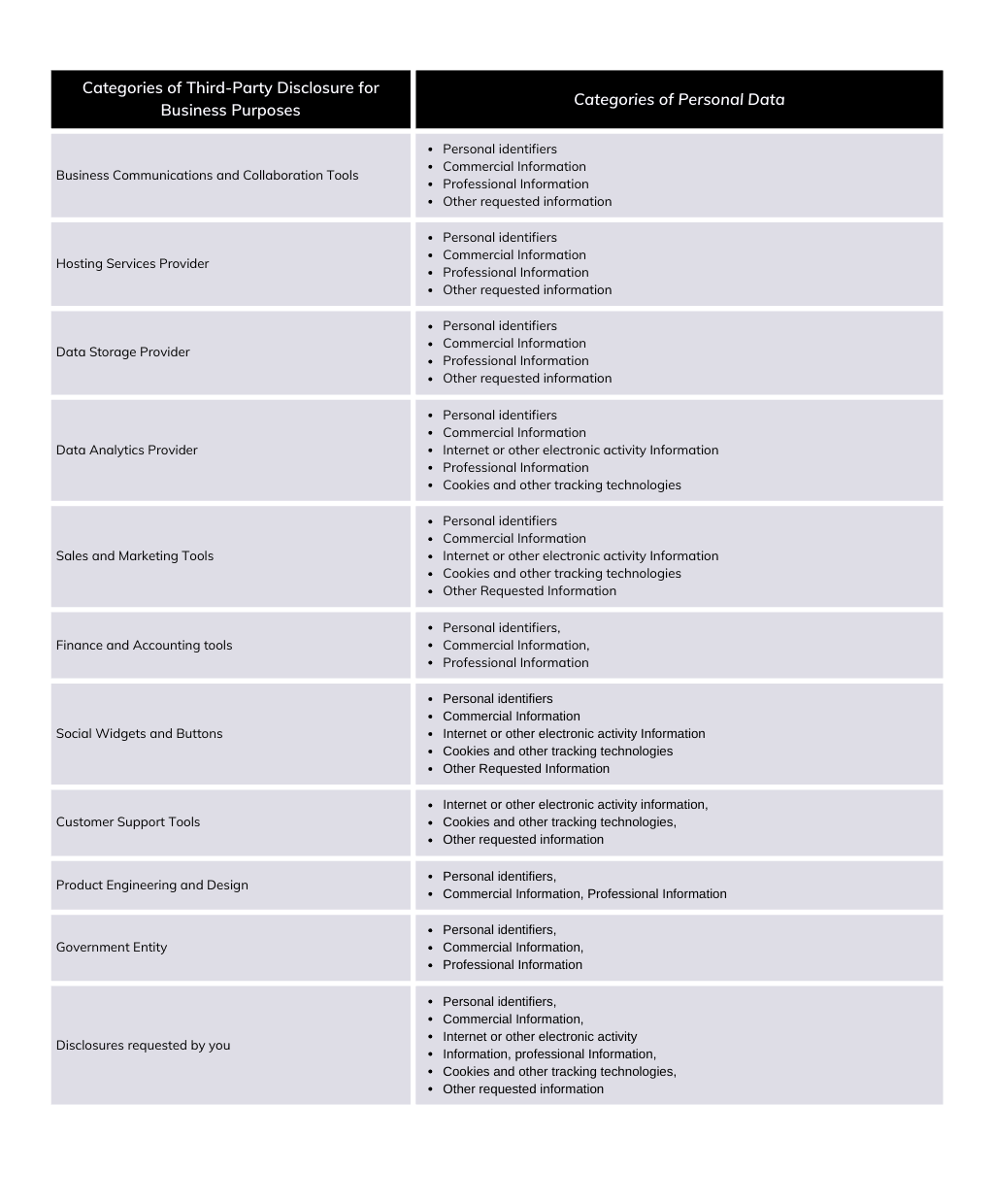 - Personal identifiers - Name, alias, business address, business email, social media handle, telephone number, IP addresses, unique personal identifiers, online identifiers, IP Address, and account name.